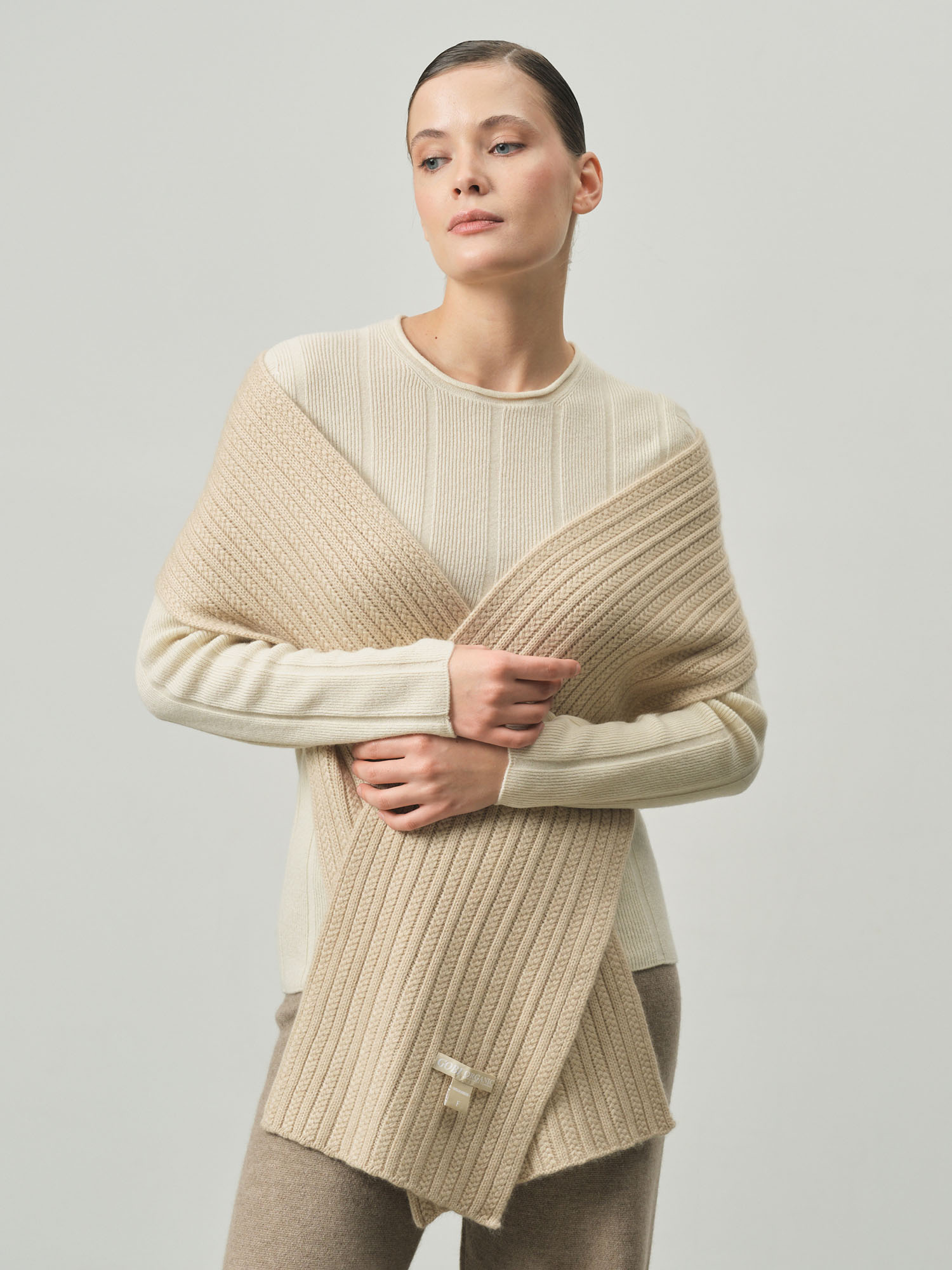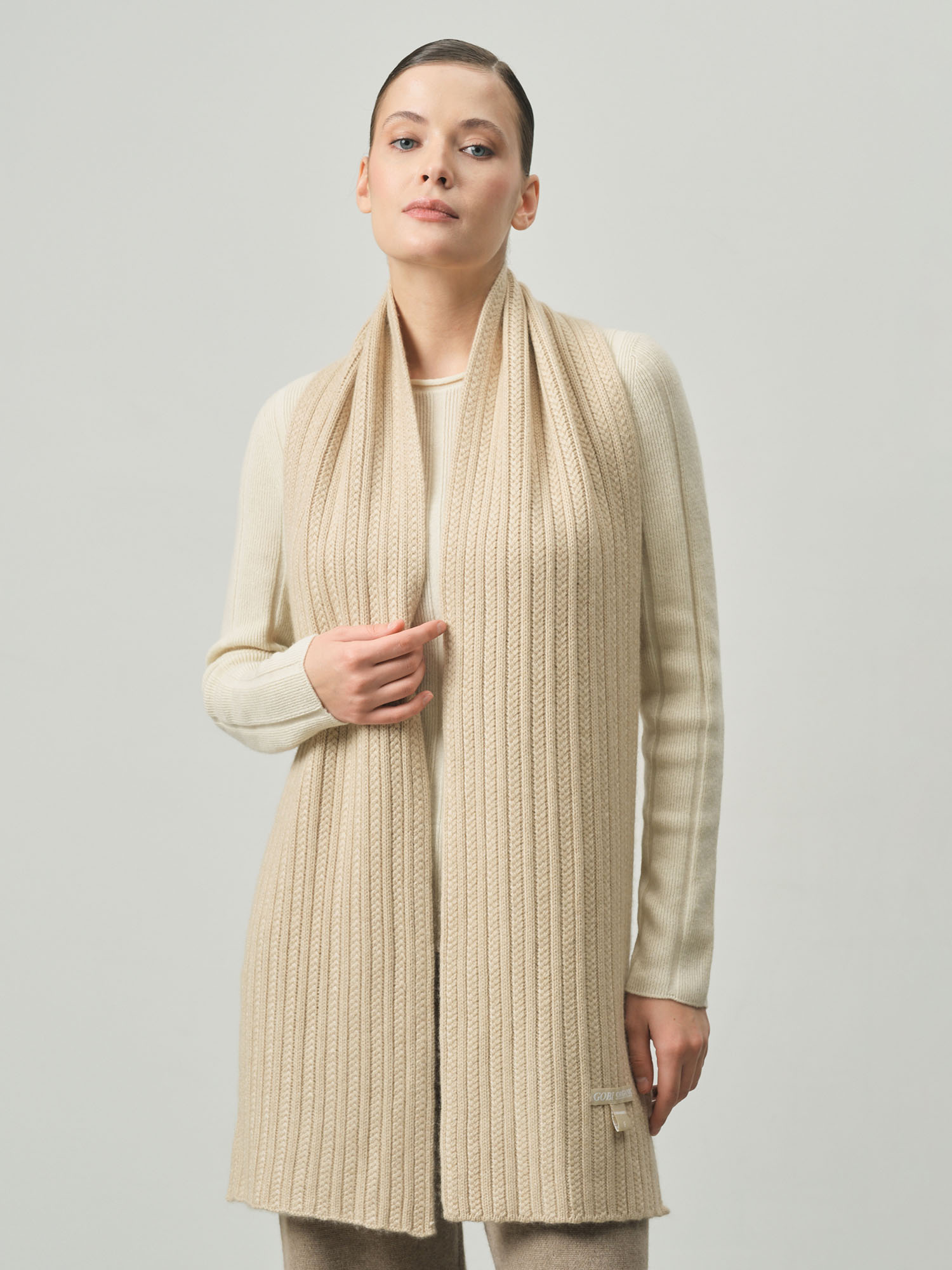 Классическая прямоугольная форма с фактурной вязкой в рубчик. Минималистичный дизайн подчёркивает благородную текстуру материала и делает шарф универсальным аксессуаром для различных образов.