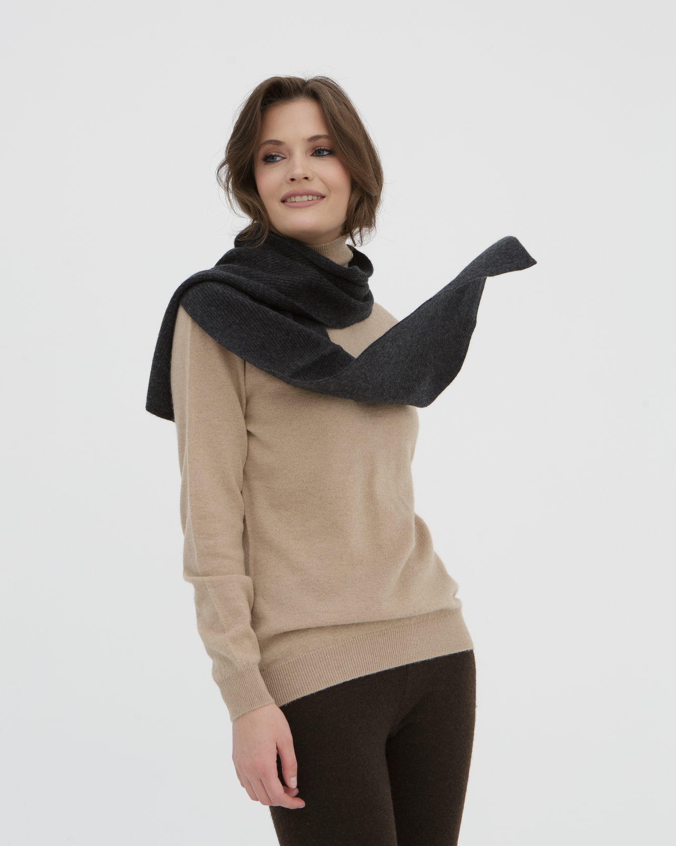 Классическая прямоугольная форма с гладкой аккуратной вязкой. Минималистичный дизайн без декоративных элементов подчеркивает благородство материала и делает изделие универсальным. Полотно мягко драпируется, создавая аккуратный и элегантный силуэт.