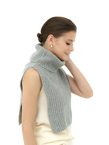 Модель выполнена в виде укороченной накидки с высоким воротником-стойкой. Рельефная вертикальная вязка придаёт изделию выразительную текстуру и помогает сохранять форму. Минималистичный дизайн делает манишку универсальной и современной.
