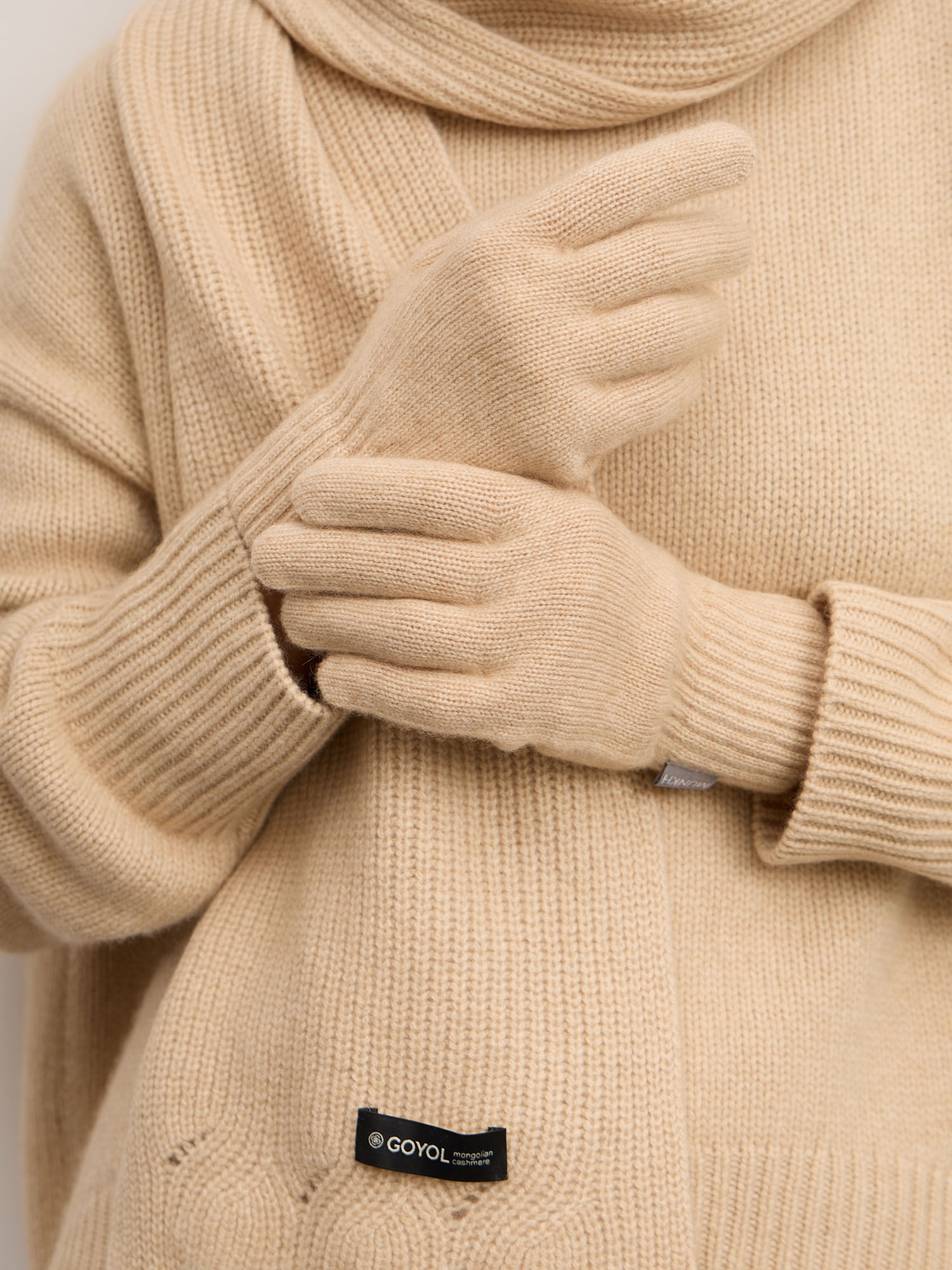 Почувствуйте прикосновение настоящего премиального кашемира. Бежевые перчатки из 100% кашемира — это не просто аксессуар, а ежедневный источник уюта и тепла. Они мягко облегают руки, словно вторая кожа, защищая от холода и сохраняя комфорт даже при длительном ношении. Идеальный баланс эстетики, функциональности и натуральной роскоши, созданный с учетом традиций обработки монгольского кашемира