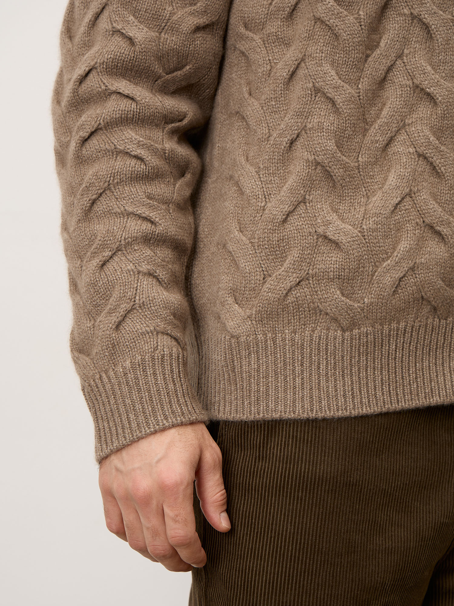 Классический силуэт с фактурной вязкой в виде кос. Аккуратный воротник на молнии добавляет функциональности и современного стиля.