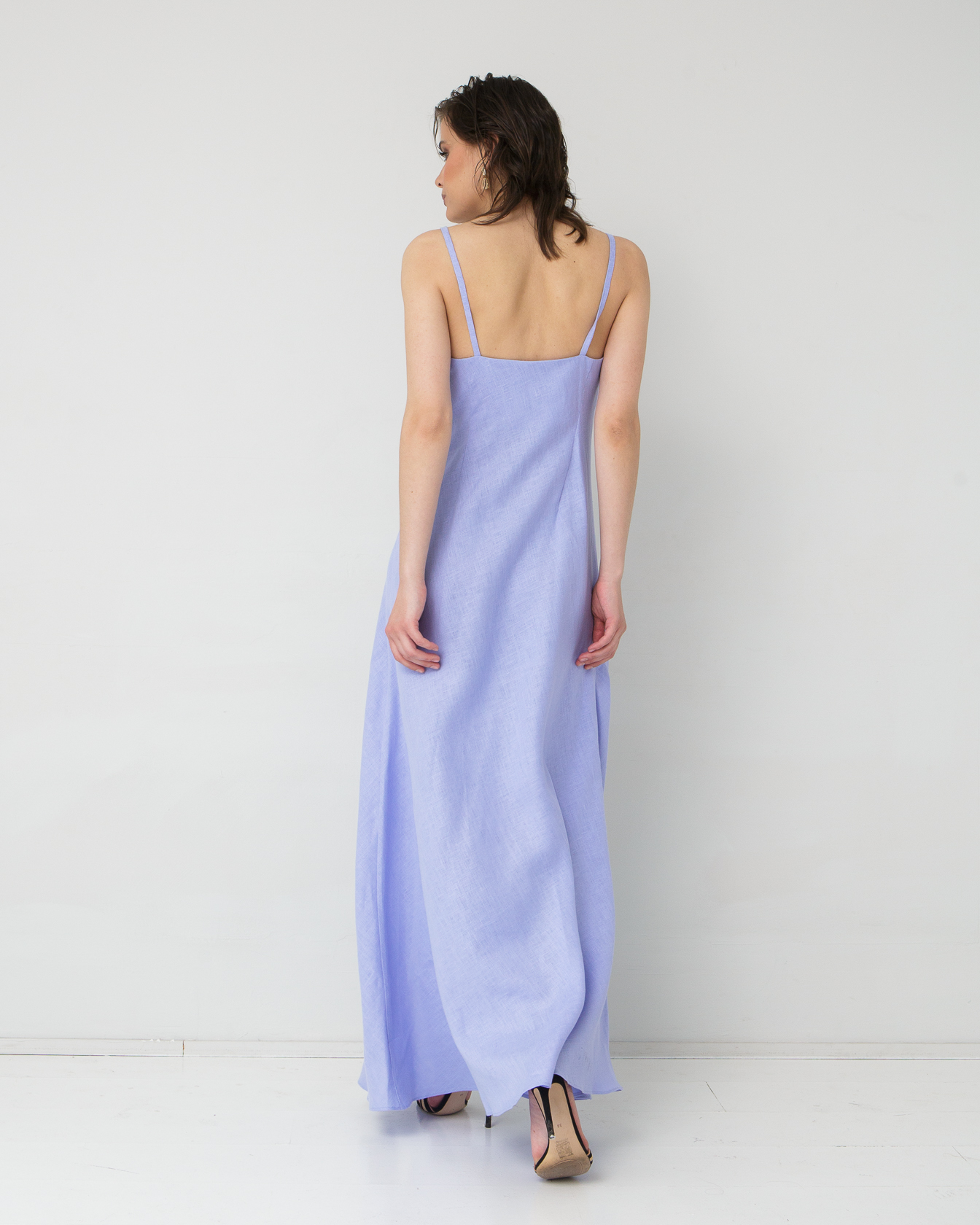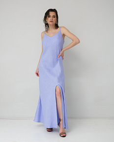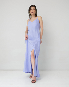 Платье отличается изысканным кроем на тонких бретелях с V-образным вырезом, подчеркивающим линию декольте. Элегантная высокая боковая разрезка добавляет модели женственности и легкости, обеспечивая свободу движений. Свободный силуэт деликатно обыгрывает фигуру, создавая эффект воздушности и грации. Нежный лавандовый оттенок привносит в образ романтичность и утонченность.