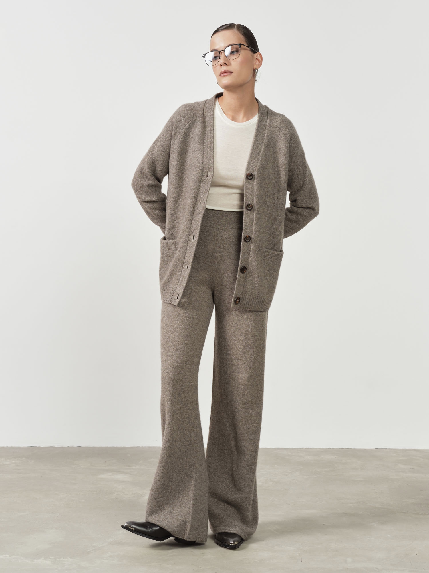 Природный рыжеватый оттенок верблюжьей шерсти придает изделию благородную эстетику и подчеркивает его натуральное происхождение. Особенность шерсти верблюжонка в том, что она в два раза теплее овечьей при вдвое меньшем весе, что делает кардиган идеальным выбором для холодного времени года без утяжеления образа.